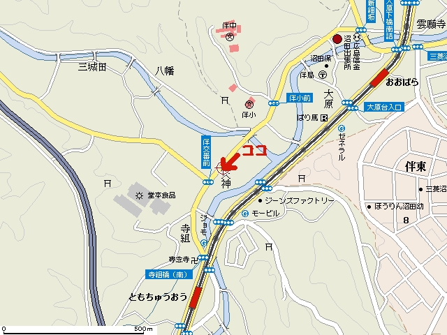 道なりに直進、右手に伴小学校をすぎて200mほど進んだ